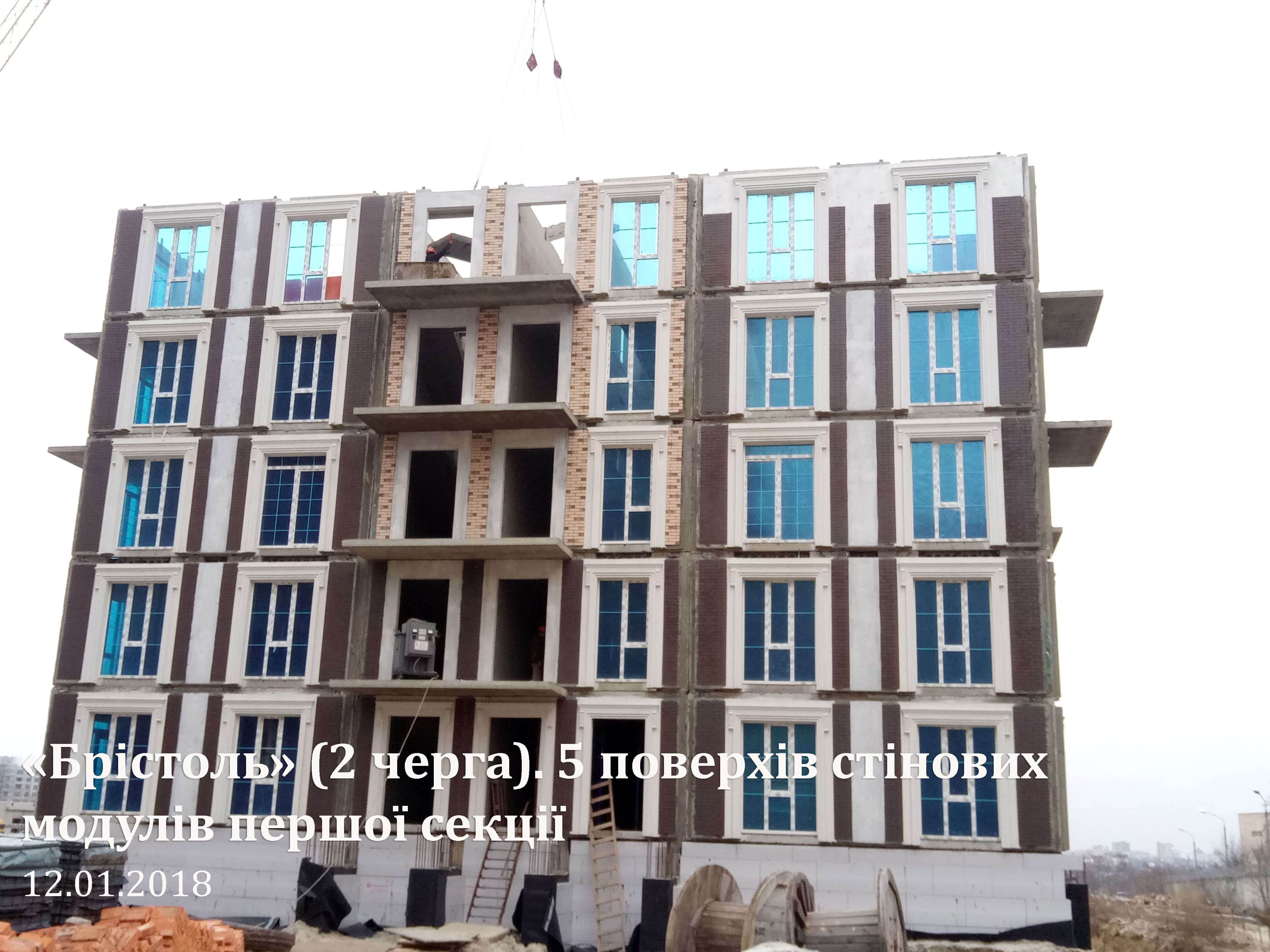У будинку «Брістоль», що у другій черзі будівництва міста в місті «Нова Англія», зведено 5 поверхів стінових модулів Royal House у першій секції будівлі. Вже йде монтаж баштового крану для проведення висотних робіт. Тривають роботи з гідроізоляції фундаменту та армуванню стін підвалу двох секцій будівлі.